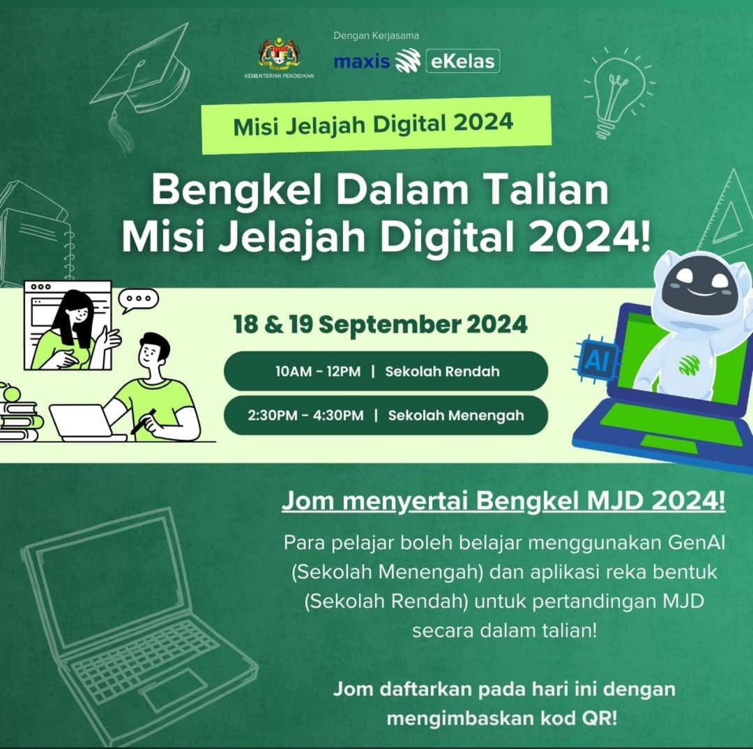 • Bengkel ini merupakan anjuran maxis ekelas. Tahun ini, tema MJD ialah “GenAI untuk Kebaikan” atau “GenAI for Good”. Pelajar berpeluang untuk mempelajari tentang Penjanaan Kecerdasan Buatan (GenAI) serta cara-cara untuk menggunakan GenAI untuk menyelesaikan isu semasa. Tidak kira sama ada pelajar akan gunakannya untuk menjana idea atau membuat pembentangan, inilah peluang pelajar untuk menggunakan GenAI secara kritikal sambil menunjukkan idea anda. Tentu sekali tidak ketinggalan, penggunaan alatan digital yang lain seperti carian Google, program perisian Microsoft PowerPoint dan juga Internet untuk menjadikan “Idea ke Aksi”